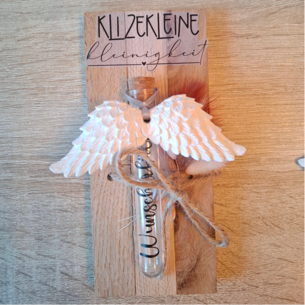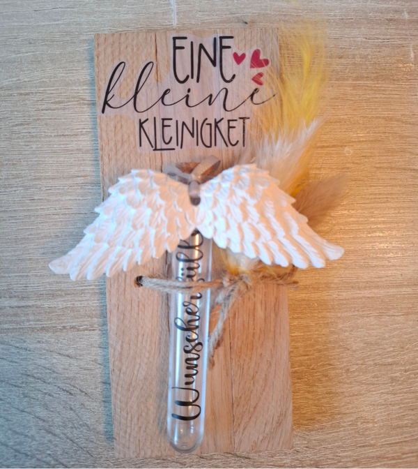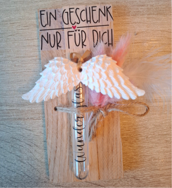 Ein kleines Geschenk mit großer Bedeutung. Das „Kleine Geschenk“ ist eine charmante und durchdachte Idee, um jemandem eine Freude zu bereiten. Es besteht aus einem zarten Engelsflügel-Anhänger und einem dekorativen Reagenzgläschen, das individuell befüllt werden kann. Ob glitzernde Partikel, kleine ausgeschnittene Sterne, ein persönlicher Gutschein oder sogar eine liebe Botschaft – das Reagenzgläschen bietet vielseitige Möglichkeiten, um diesem Geschenk eine persönliche Note zu verleihen. Diese süße Geste eignet sich perfekt für verschiedenste Anlässe, sei es als kleines Dankeschön, als Mitbringsel oder einfach, um jemandem ein Lächeln ins Gesicht zu zaubern. Eine vielzahl von Sprüchen stehen zur Auswahl zur Verfügung.