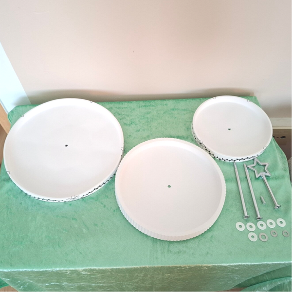 Die Etagere wird abgebaut geliefert. Teller sind mit Jesmonit-Wachsversiegelt und Lebensmittelecht.
