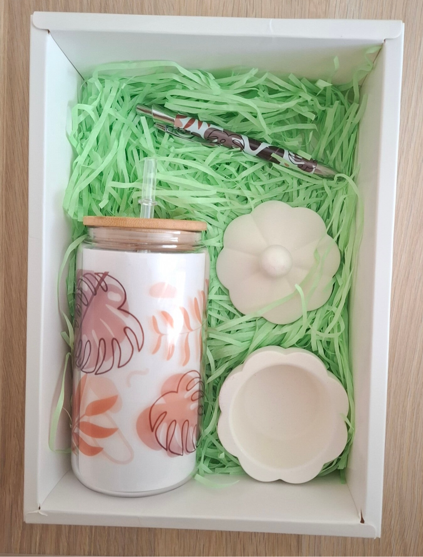 Das stilvolle Geschenk für jeden Anlass. Suchen Sie ein neutrales, aber gleichzeitig stilvolles Geschenk? Das Geschenkpackage "Bohostyle" ist die ideale Wahl! Die elegante Geschenkbox mit milchigem Schiebedeckel ist liebevoll befüllt und überzeugt durch ihren einzigartigen Inhalt: ein hochwertiges Trinkglas mit "Bambusdeckel und Strohhalm in BOHO-Blätter", einen schicken "BOHO-Kugelschreiber" und die stilvolle Dose "Blume". Dieses harmonisch abgestimmte Set vereint Funktionalität und Design und ist perfekt geeignet, um Freude zu bereiten – sei es als Geburtstagsgeschenk, Dankeschön oder kleine Aufmerksamkeit. Überraschen Sie Ihre Liebsten mit diesem geschmackvollen und zeitlosen Geschenk! Himweis: Glas nur für Handwäsche geeignet!!!